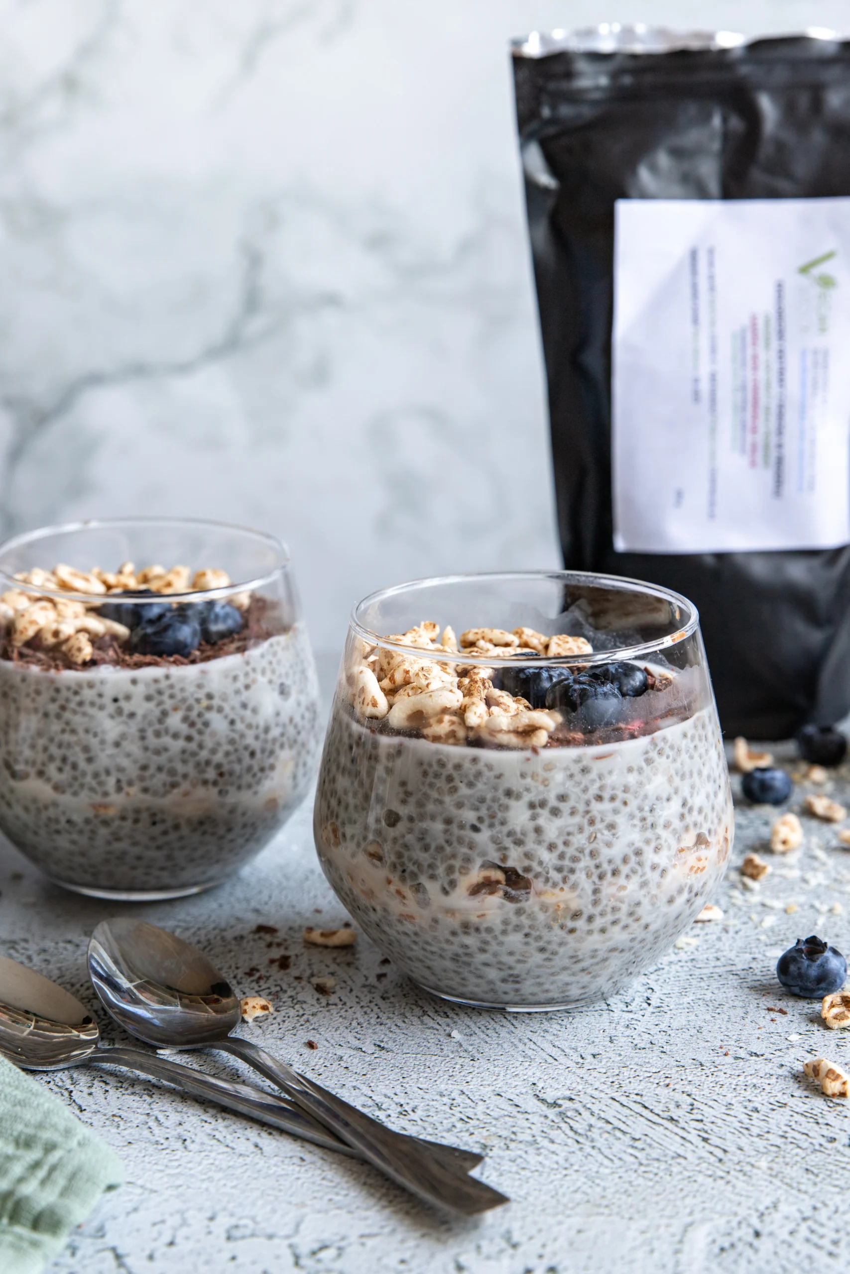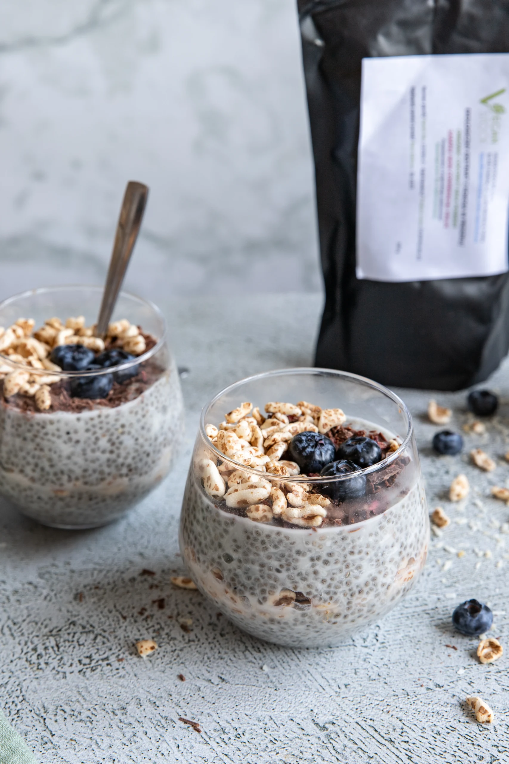 During this time, the chia seeds will absorb the liquid and swell. Spoon half of the pudding into glasses, add a layer of puffed spelt, and top with the remaining pudding. Decorate with chopped chocolate, puffed spelt, and blueberries.